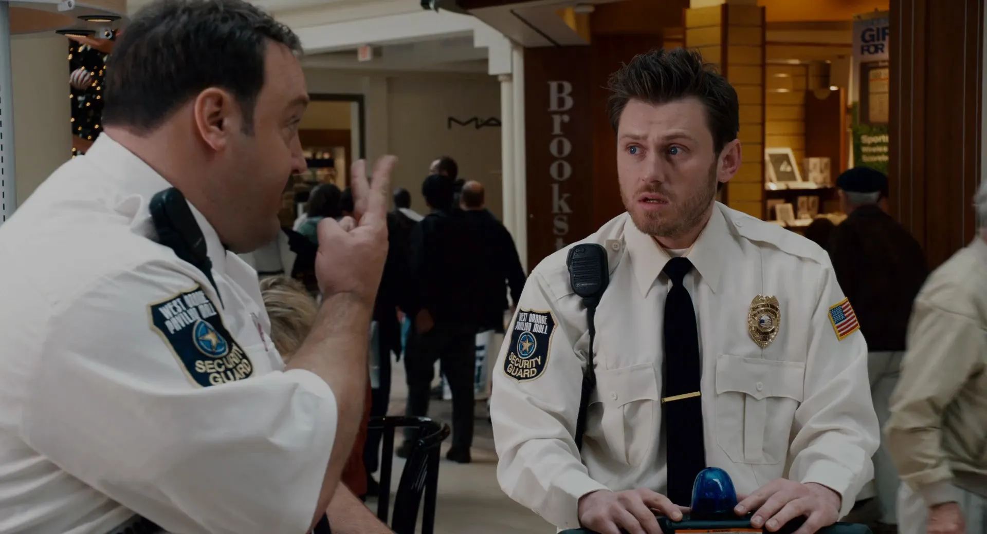 Cast: Kevin James as Paul Blart, Keir O'Donnell as Veck Sims, Jayma Mays as Amy, Bobby Cannavale as Cmdr. James Kent, Shirley Knight as Mom, Raini Rodriguez as Maya Blart, Stephen Rannazzisi as Stuart, Peter Gerety as Chief Brooks, Adam Ferrara as Sergeant Howard, Jamal Mixon as Leon, Adhir Kalyan as Pahud, Erick Avari as Vijay, Gary Valentine as Karaoke Singer, Allen Covert as Jerky Security Guy, Mike Vallely as Rudolph, Mike Escamilla as Blitzen, Jason Ellis as Prancer, Jason Packham as Comet, Rick Thorne as Cupid, Victor T. Lopez as Donner, Natascha Hopkins as Vixen, Jackie Sandler as Victoria's Secret Sales Associate, Mookie Barker as Mr. Ferguson, Jackie Flynn as Officer, Richie Minervini as Bank Manager, Brie Hill Arbaugh as Bank Teller, Steffiana De La Cruz as Shopper with Kids, Dylan Clark Marshall as Jacob, Bernie McInerney as Old Man on Scooter, Tyler Spindel as SWAT Tech, Bas Rutten as Drill Instructor, Teresa Zantua as Shopper, Dahlia Salem as Mother, Zele Avradopoulos as Victoria's Secret Customer, Maria Arcé as Victoria's Secret Customer, Robert Harvey as SWAT Officer, Billy Concha as Joe's Patron, Michael Burton as Joe's Patron, Carl Randall as Father Carl, Carla Antonino as Joe's Waitress, Ruby Wendell as Ruby the Waitress, Lindsay MacDonald as Girl at Mall, Donna Glee Reim as Mall Patron, Dale F. Appel as Mall Shopper, Joel Arsenault as Mall Cop, Stephanie Atkinson as Shopper, Amber Baldinelli as Girl in Mall Throwing Play Balls, William Bornkessel as Shopper, Mike Burton as Joe, Katelyn Cahill as Wedding Guest, Patrick Canty as New Jersey Police Academy Trainee, Gio Castellano as Mall Shopper, Jeffrey Corazzini as Security Guard, D.W. Cormier as Mall Shopper, Benjamin Crocker as Mall Shopper, Nicholas Davis as Kid in Ball Pit, Kevin DeCoste as Shopper, Michael DeMello as Shopper, Hannah Depew as Mall Shopper, Vincent J. Earnshaw as Mall Shopper, Suzanne England as Amy's Friend at Joe's, Susan Farese as Upscale Shopper, Keith Fluker as New Jersey State Trooper, Andy Forgit as Mall Shopper, Victor Franko as Mall Shopper, Sari Gagnon as Mall Shopper, David J. Garfield as Surveillence Officer, Suzanne Gillies as Upscale Shopper, Albert Gornie as Wedding Guest, Rob W. Gray as Wedding Guest, Dane Grigas as Mall Shopper, Teresa Haney as Mall Shopper, Cody Harter as Mall Shopper, Matt Heron-Duranti as Mall Shopper, Mark Hetherington as Mall Shopper, Louis Holmes as Police Recruit, Ren Knopf as Shopper, Lynn L'Heureux as Mall Shopper, Dan Marshall as Mall Shopper / Dancing Bistro Waiter at Wedding, Andrew J McGuinness as Shopper, Todd Mello as New Jersey State Trooper, Jason Mulcahy as Police Recruit, Ron Murphy as Pedestrian, Scott Neufville as Bartender, Chris Palermo as Wedding Guest, Aaron J. Patton as Police Recruit, Alan Resnic as Mall Shopper, Brieann Rich as Mall Shopper, Michael Rich as Mall Game Shopper, Nicholas Rich as Mall Shopper, Bradley Robinson as Mall Shopper, Jessica Rockwood as Mall Shopper, Gary Roscoe as Restaurant Patron, Jonathan Sawicki as Mall Shopper, Cate Smit as William Sonoma Employee, Gustin Smith as Video Game Hurdler, Ylian Alfaro Snyder as Upscale Mall Shopper, Jon Robert Stafford as Mall Shopper, George J. Vezina as Bar Patron / Shopper, Donald Warnock as Wedding Guest, Jon Warnock as Late-Night Mall Denizen, Mike Wendt as Mall Shopper, Kent R. Williams as Shopper